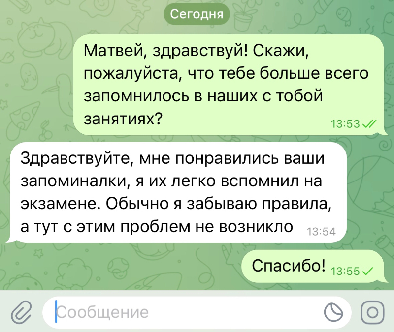 - «Сели заниматься, вроде всё объяснила, вместе порешали, почитали... А через час ребёнок смотрит на меня глазами-«ну я вообще не понимаю, о чём ты». Как будто и не было занятия!»